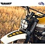 Steel headlight with integrated stone guard and fitting bracket, black powder-coated painted for a perfect and durable finish.
