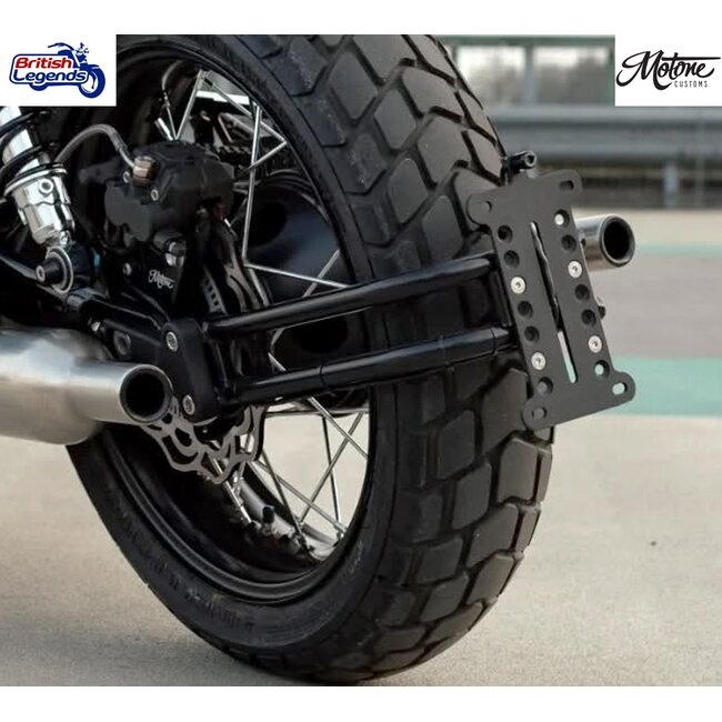 Motone's "The Claw". Complete kit to relocate the number plate behind (and centred with) the rear wheel of your bike, in a lower position than stock. This frees you to modify the mudguard and rear light functions as you like, without having to worry about how the license plate will fit in the design.