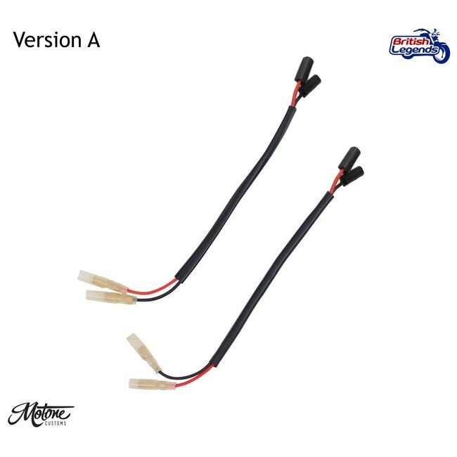 Versión D para conectar los intermitentes originales Triumph a conectores universales 3.9mm rotondos, en las mismas motos que la versión B (ver lista arriba). Por ejemplo, para reutilizar los intermitentes de fábrica con un kit "trasero corto" Motone.