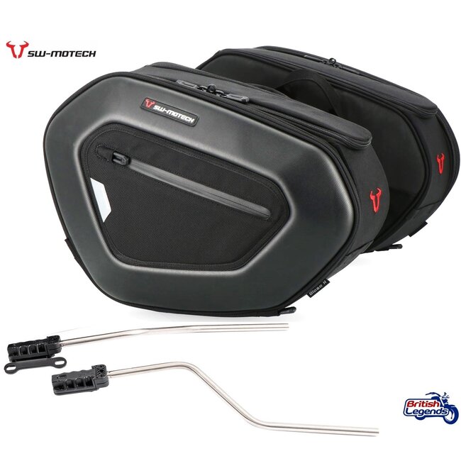 Paire de sacoches en kit complet. Les sacoches se rejoignent par le dessus (sacoches "cavalières") et sont maintenues par des écarteurs spécifiques aux motos ci-dessus.